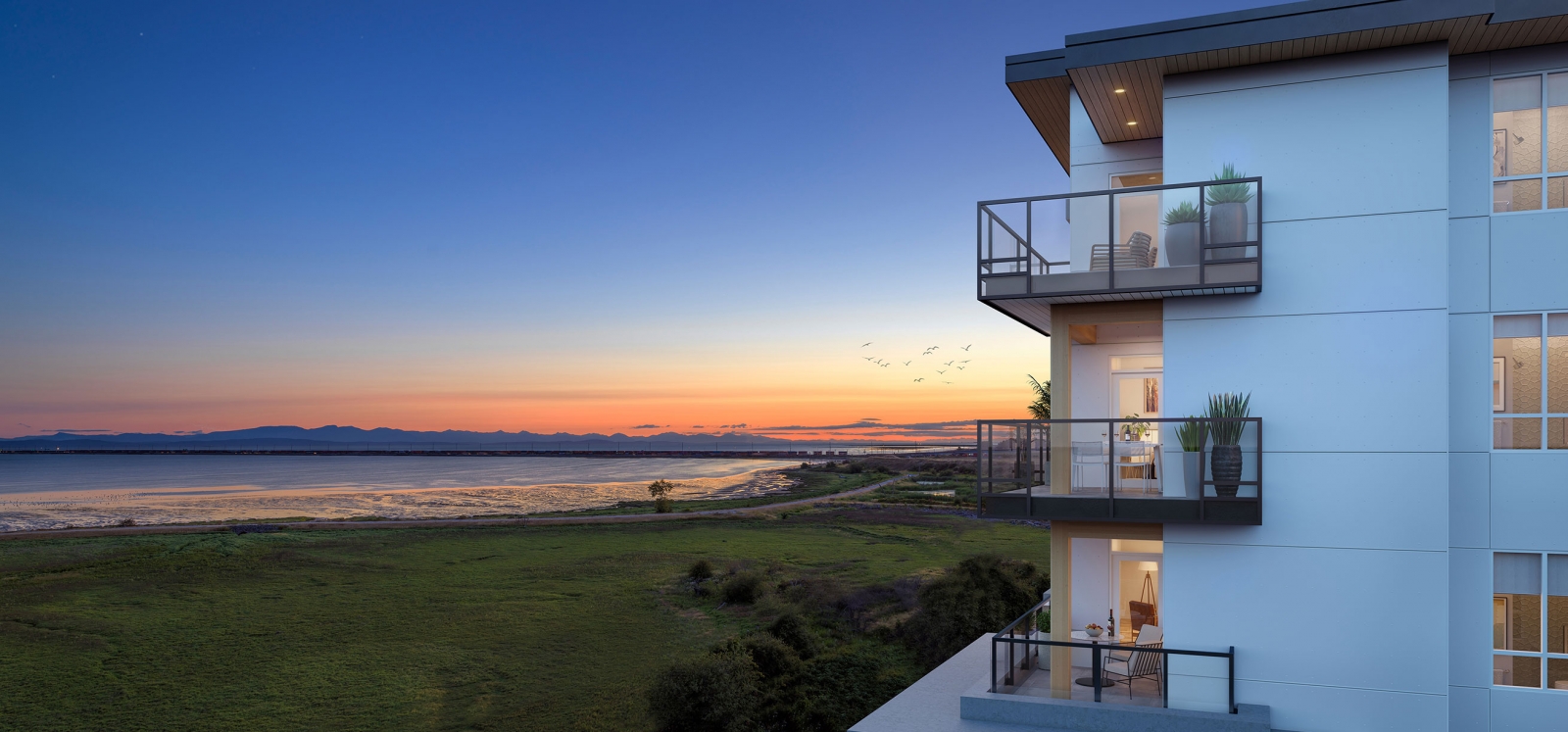 New condos, townhomes and duplexes project near the ocean boardwalk in Tsawwassen, with views of the Pacific. Amenities include a beach house with a pool, a new parkette, multiple sports fields, an outdoor fitness circuit, a connection to a boardwalk path and much more.