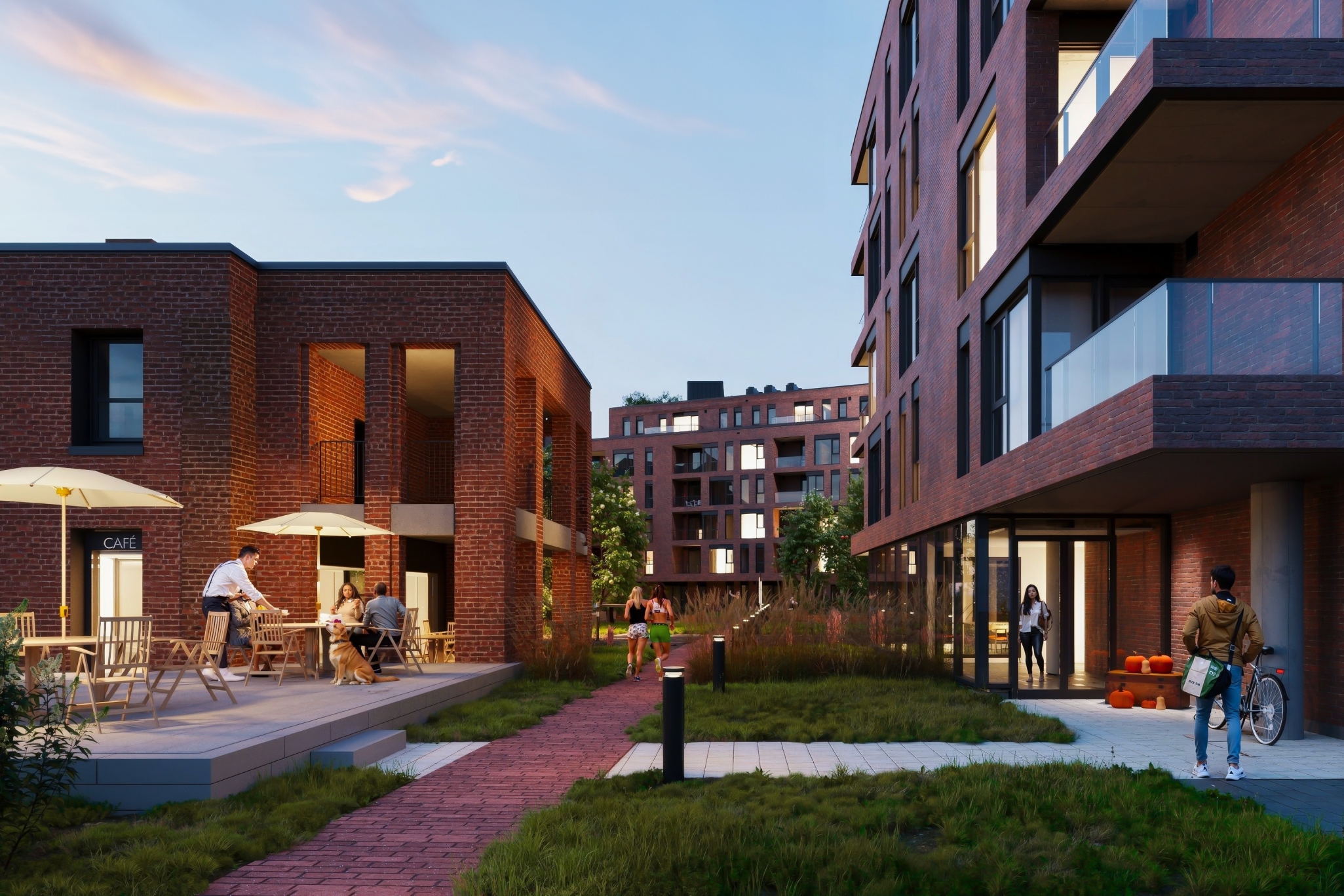 The project offers 299 rental units with various sizes and layouts. The units are spread across two buildings with distinct architectural styles, connected by a modern and warm common thread.