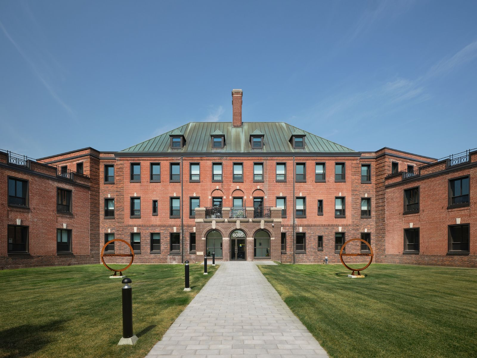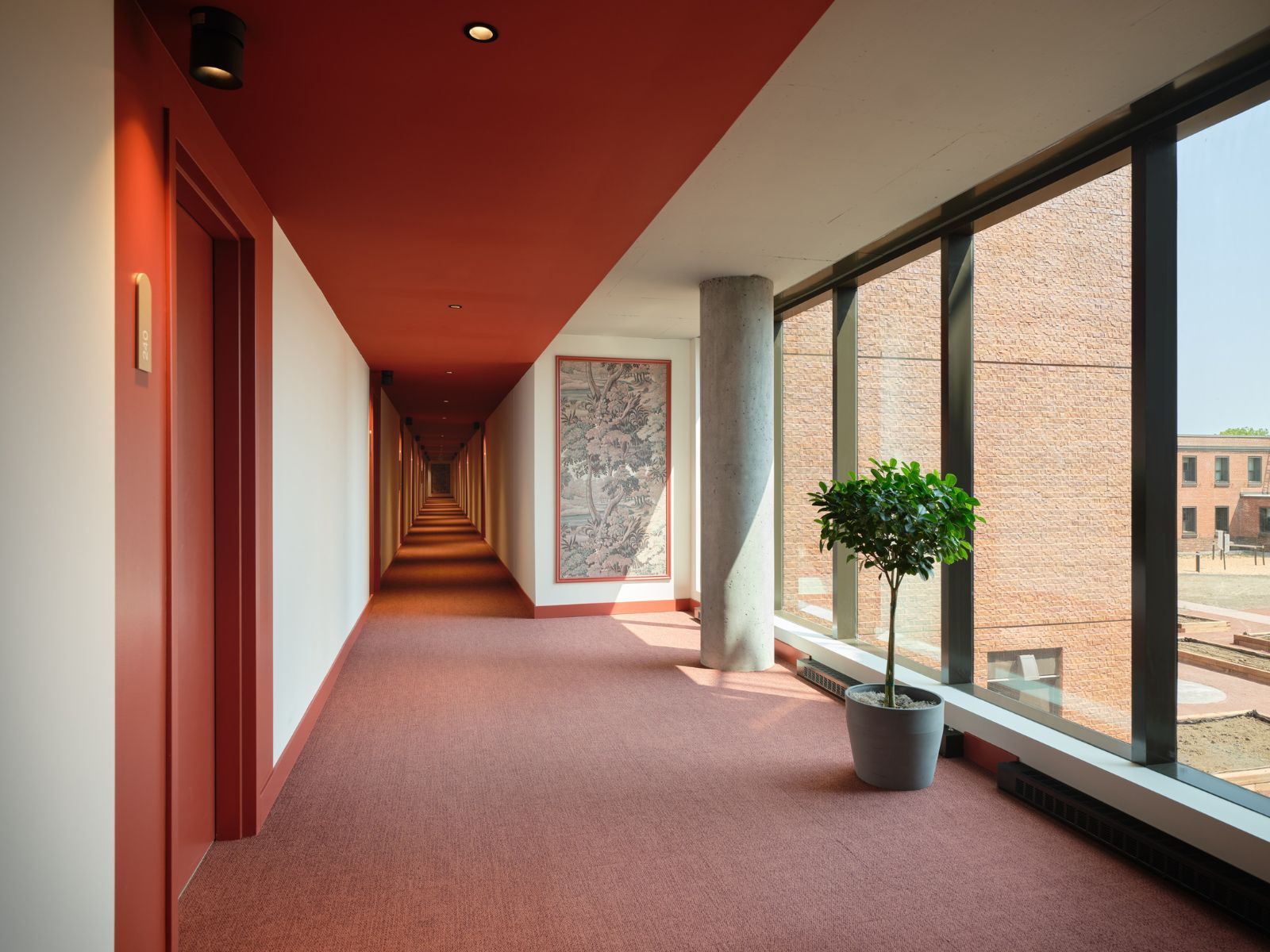 Arranged around a green inner courtyard, the buildings rise within a wooded park, providing an easy escape from the bustling urban surroundings.