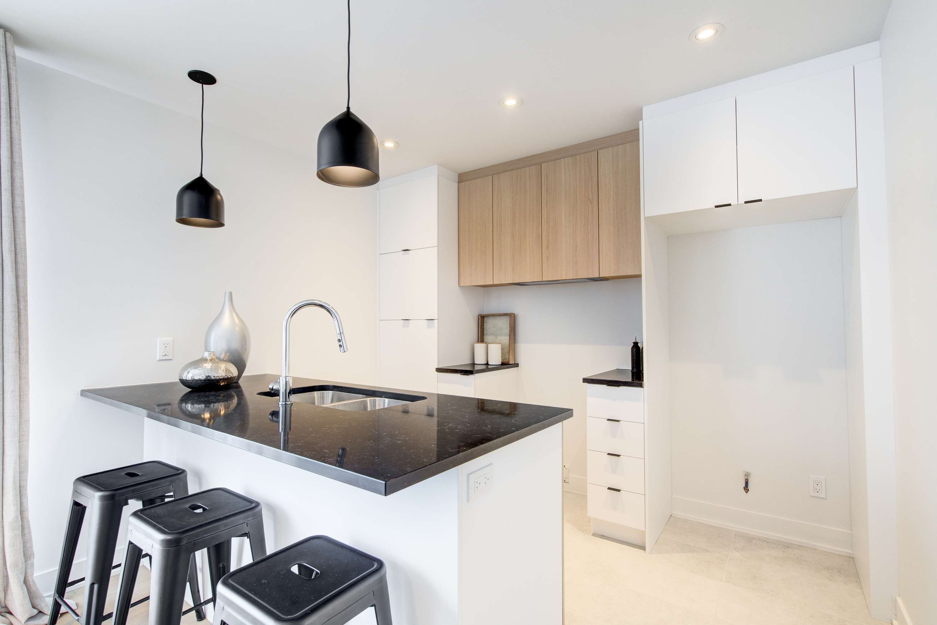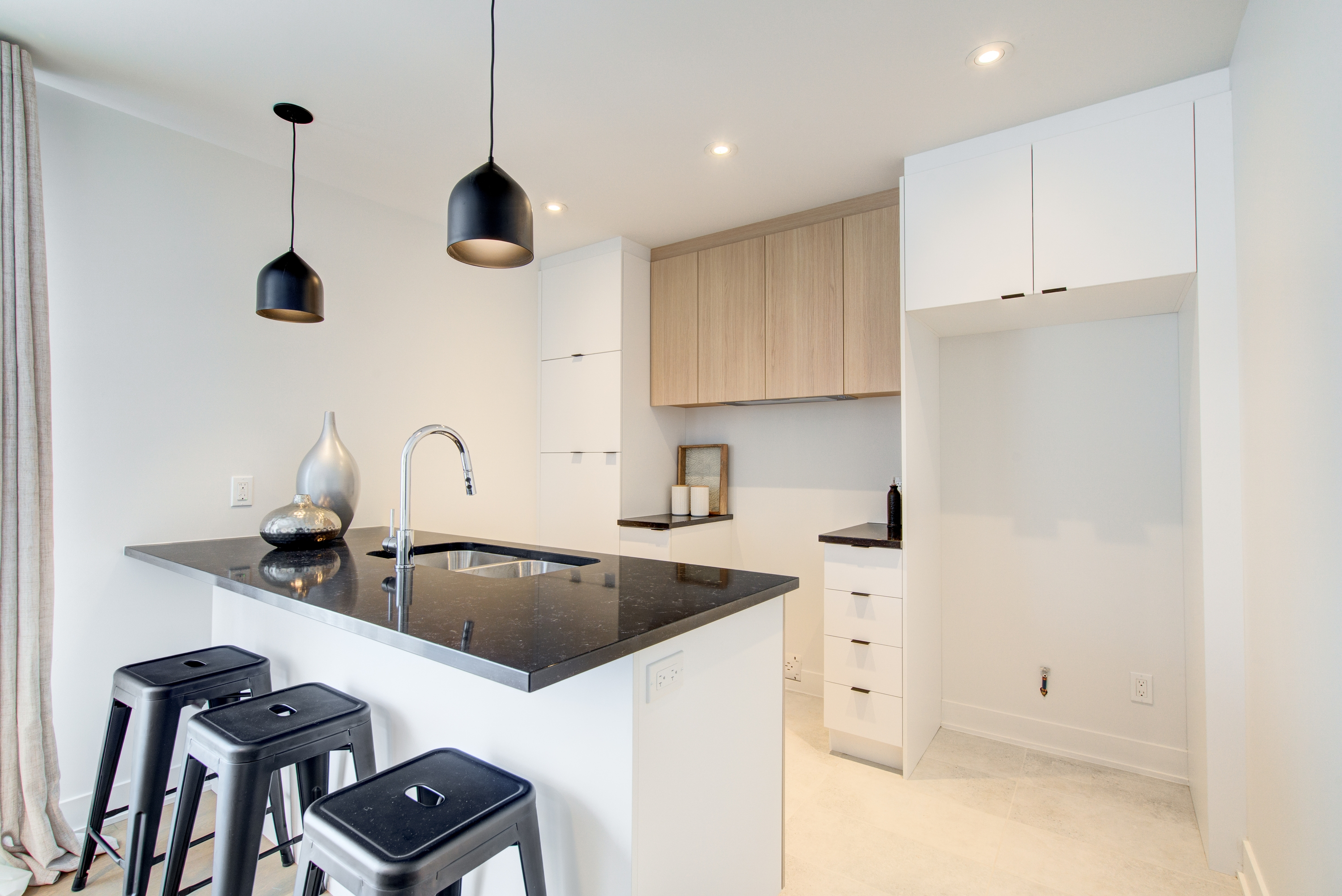 - Modern laminated kitchen cabinetry up to the ceiling, quartz countertops