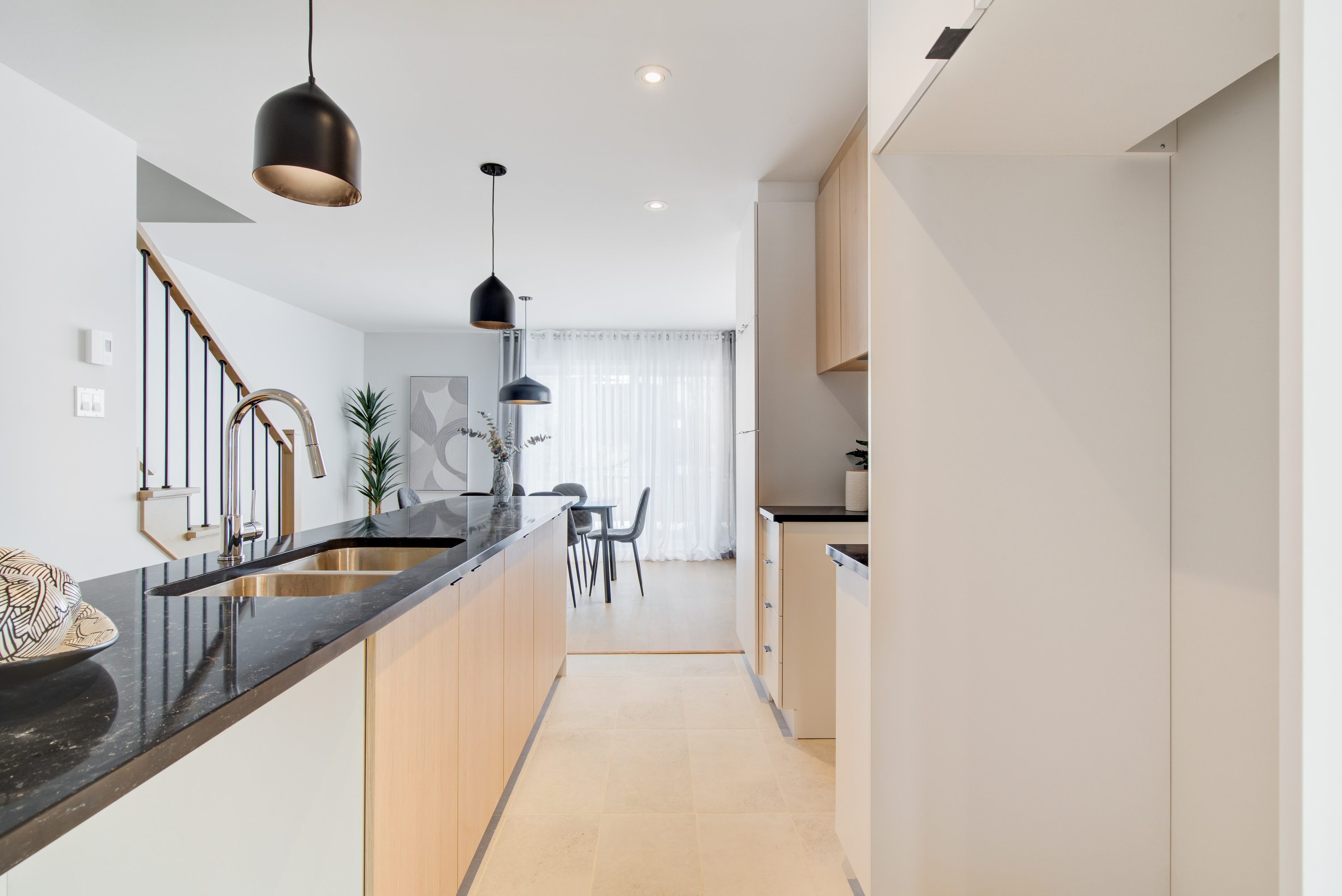 - Modern laminated kitchen cabinetry up to the ceiling, with quartz countertops